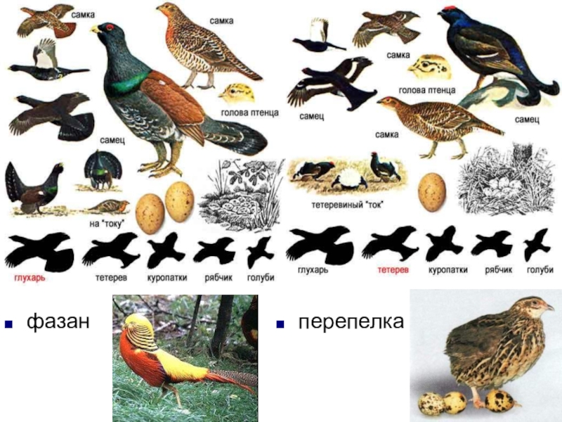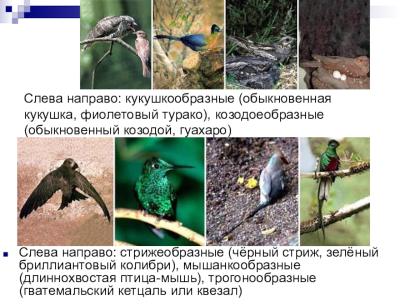 Слайд 19Слева направо: кукушкообразные (обыкновенная кукушка, фиолетовый турако), козодоеобразные (обыкновенный козодой, гуахаро)