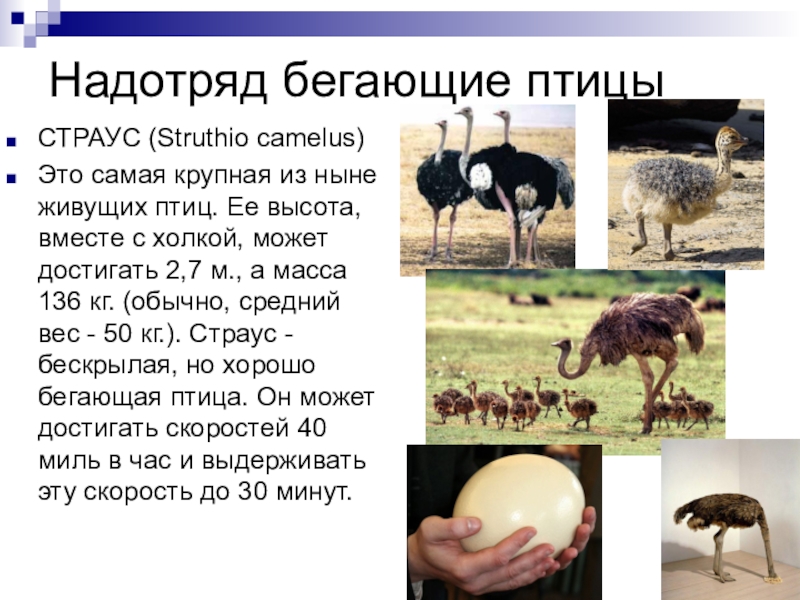 Ее высота, вместе с холкой, может достигать 2,7 м., а масса 136 кг. (обычно, средний вес - 50 кг.). Страус - бескрылая, но хорошо бегающая птица. Он может достигать скоростей 40 миль в час и выдерживать эту скорость до 30 минут.