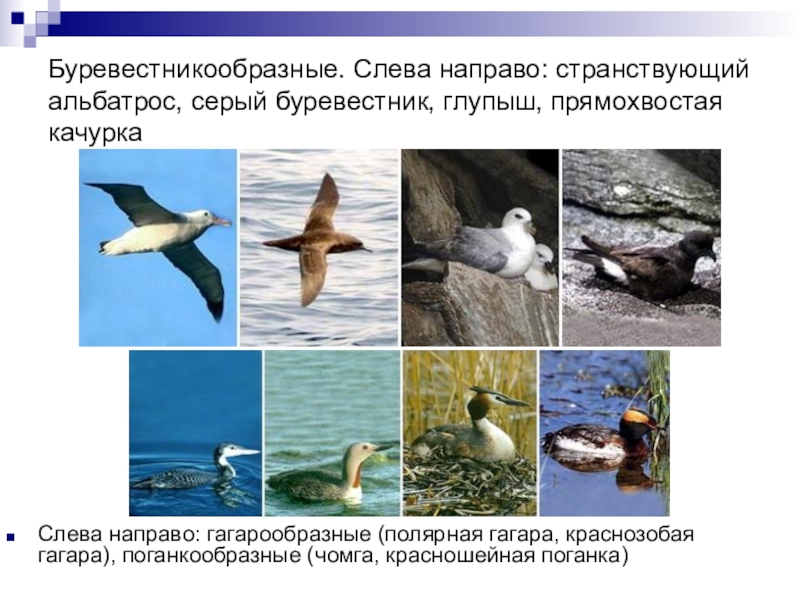 Слайд 25Буревестникообразные. Слева направо: странствующий альбатрос, серый буревестник, глупыш, прямохвостая качурка