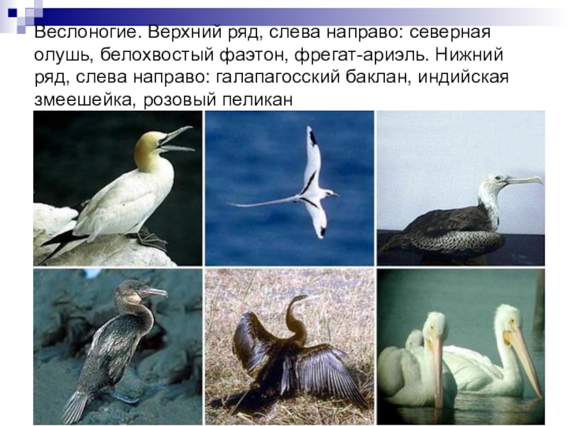 Слайд 24Веслоногие. Верхний ряд, слева направо: северная олушь, белохвостый фаэтон, фрегат-ариэль. Нижний