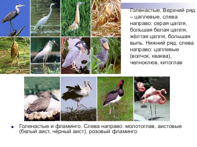 Слайд 23Голенастые. Верхний ряд – цаплевые, слева направо: серая цапля, большая белая