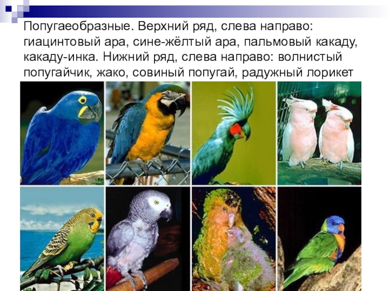 Слайд 21Попугаеобразные. Верхний ряд, слева направо: гиацинтовый ара, сине-жёлтый ара, пальмовый какаду,