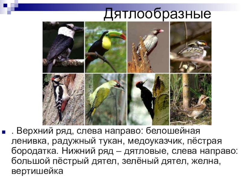 бородатка. Нижний ряд – дятловые, слева направо: большой пёстрый дятел, зелёный дятел, желна, вертишейка