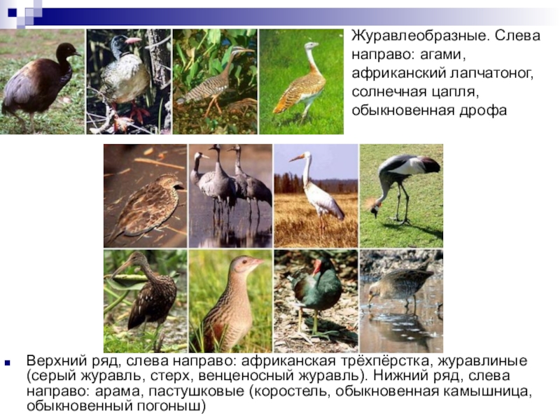 Слайд 12Журавлеобразные. Слева направо: агами, африканский лапчатоног, солнечная цапля, обыкновенная дрофа