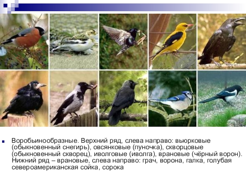 (обыкновенный скворец), иволговые (иволга), врановые (чёрный ворон). Нижний ряд – врановые, слева направо: грач, ворона, галка, голубая североамериканская сойка, сорока