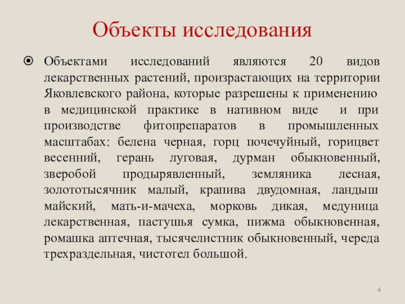 Объектами исследований являются 20 видов лекарственных растений, произрастающих на территории