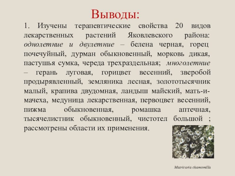 1. Изучены терапевтические свойства 20 видов лекарственных растений Яковлевского района: