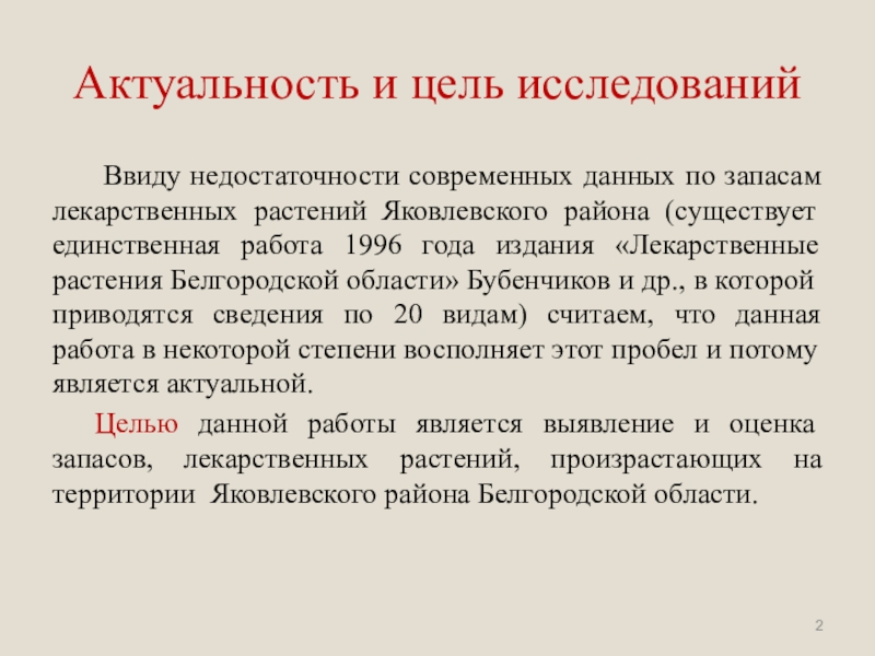 растений Яковлевского района (существует единственная работа 1996 года издания «Лекарственные растения Белгородской области» Бубенчиков и др., в которой приводятся сведения по 20 видам) считаем, что данная работа в некоторой степени восполняет этот пробел и потому является актуальной.
