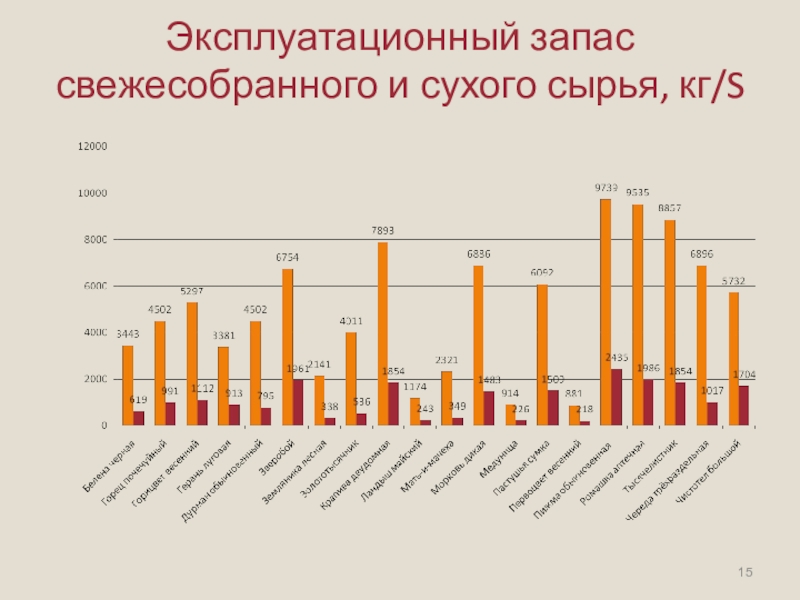 Слайд 15Эксплуатационный запас свежесобранного и сухого сырья, кг/S