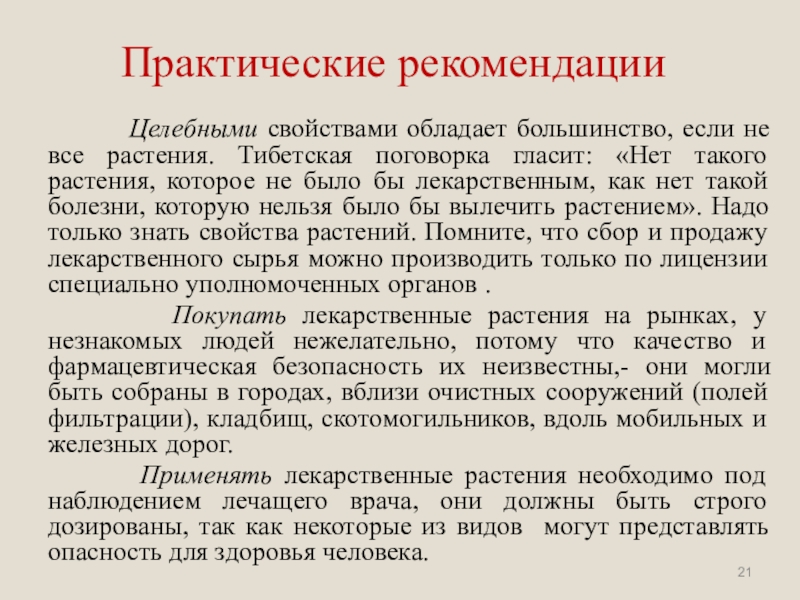 Покупать лекарственные растения на рынках, у незнакомых людей нежелательно, потому что качество и фармацевтическая безопасность их неизвестны,- они могли быть собраны в городах, вблизи очистных сооружений (полей фильтрации), кладбищ, скотомогильников, вдоль мобильных и железных дорог.