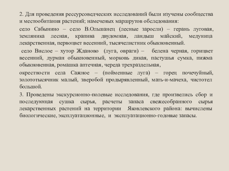 Слайд 202. Для проведения рессурсоведческих исследований были изучены сообщества и местообитания растений;