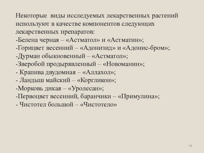 Слайд 19Некоторые виды исследуемых лекарственных растений используют в качестве компонентов следующих