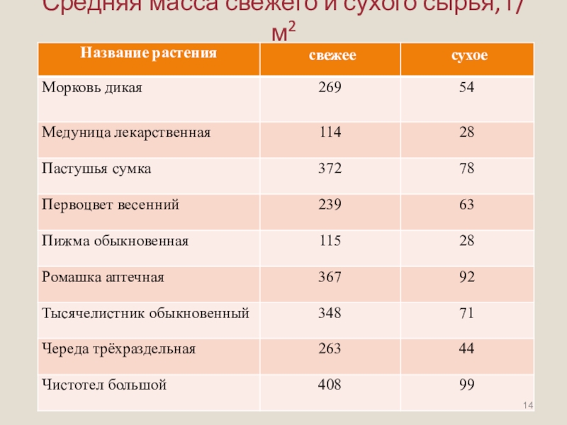 Слайд 14Средняя масса свежего и сухого сырья, г/ м2