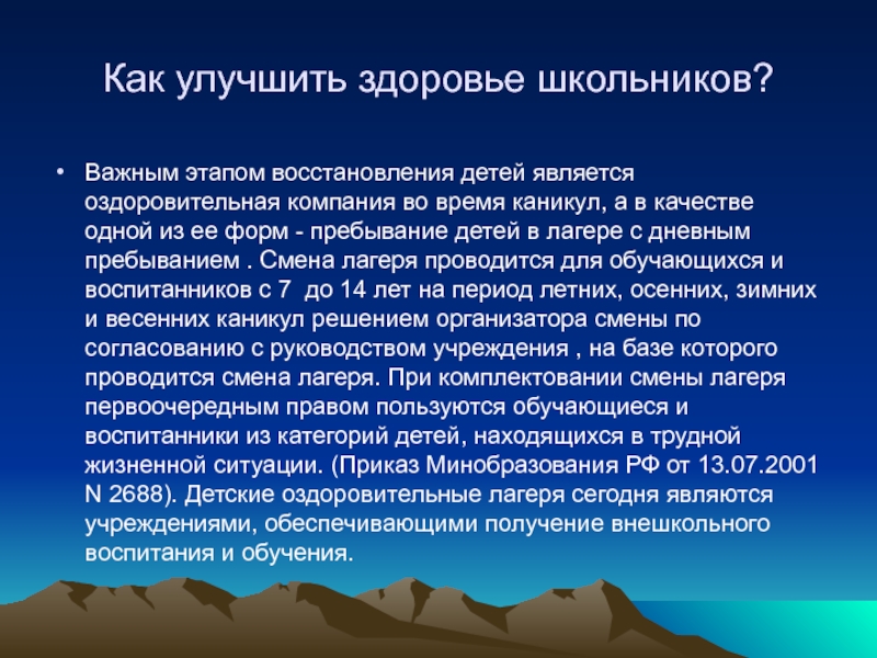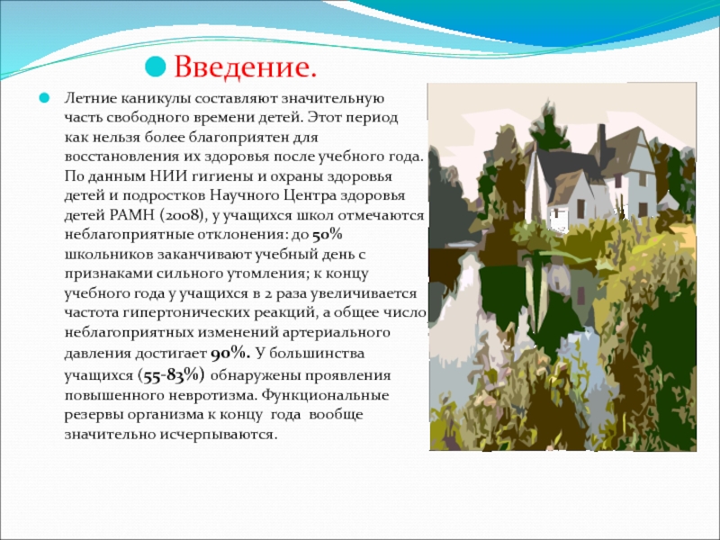 нельзя более благоприятен для восстановления их здоровья после учебного года. По данным НИИ гигиены и охраны здоровья детей и подростков Научного Центра здоровья детей РАМН (2008), у учащихся школ отмечаются неблагоприятные отклонения: до 50% школьников заканчивают учебный день с признаками сильного утомления; к концу учебного года у учащихся в 2 раза увеличивается частота гипертонических реакций, а общее число неблагоприятных изменений артериального давления достигает 90%. У большинства учащихся (55-83%) обнаружены проявления повышенного невротизма. Функциональные резервы организма к концу года вообще значительно исчерпываются.