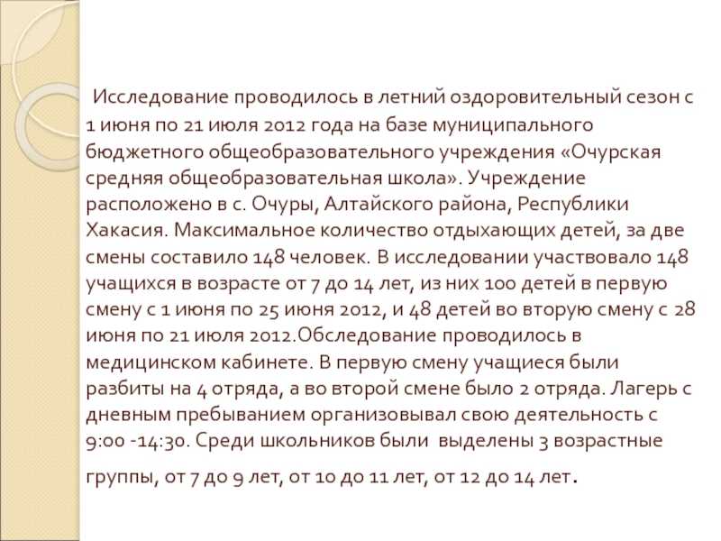 21 июля 2012 года на базе муниципального бюджетного общеобразовательного учреждения «Очурская средняя общеобразовательная школа». Учреждение расположено в с. Очуры, Алтайского района, Республики Хакасия. Максимальное количество отдыхающих детей, за две смены составило 148 человек. В исследовании участвовало 148 учащихся в возрасте от 7 до 14 лет, из них 100 детей в первую смену с 1 июня по 25 июня 2012, и 48 детей во вторую смену с 28 июня по 21 июля 2012.Обследование проводилось в медицинском кабинете. В первую смену учащиеся были разбиты на 4 отряда, а во второй смене было 2 отряда. Лагерь с дневным пребыванием организовывал свою деятельность с 9:00 -14:30. Среди школьников были выделены 3 возрастные группы, от 7 до 9 лет, от 10 до 11 лет, от 12 до 14 лет.
