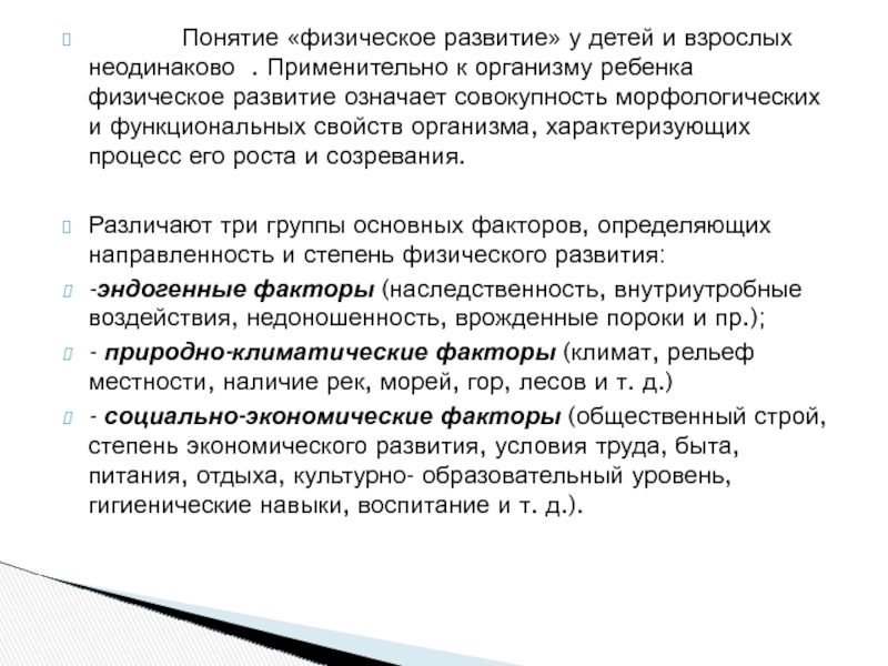 Различают три группы основных факторов, определяющих направленность и степень физического развития: