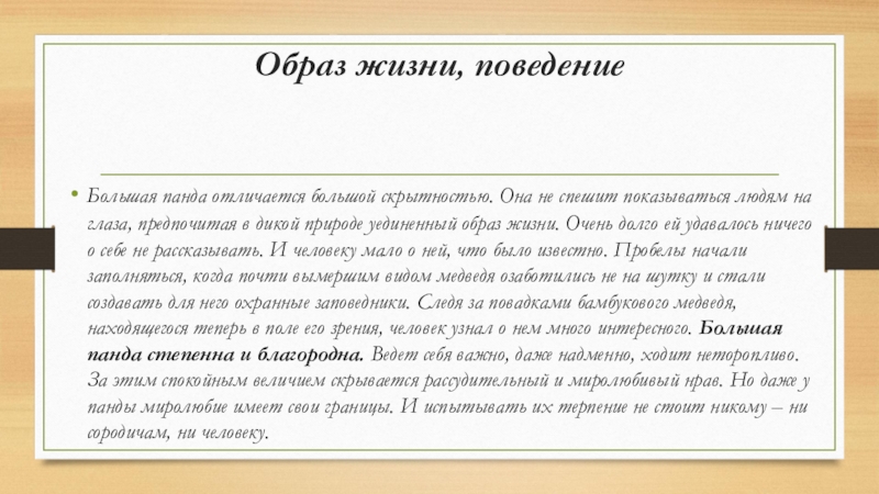 людям на глаза, предпочитая в дикой природе уединенный образ жизни. Очень долго ей удавалось ничего о себе не рассказывать. И человеку мало о ней, что было известно. Пробелы начали заполняться, когда почти вымершим видом медведя озаботились не на шутку и стали создавать для него охранные заповедники. Следя за повадками бамбукового медведя, находящегося теперь в поле его зрения, человек узнал о нем много интересного. Большая панда степенна и благородна. Ведет себя важно, даже надменно, ходит неторопливо. За этим спокойным величием скрывается рассудительный и миролюбивый нрав. Но даже у панды миролюбие имеет свои границы. И испытывать их терпение не стоит никому – ни сородичам, ни человеку.