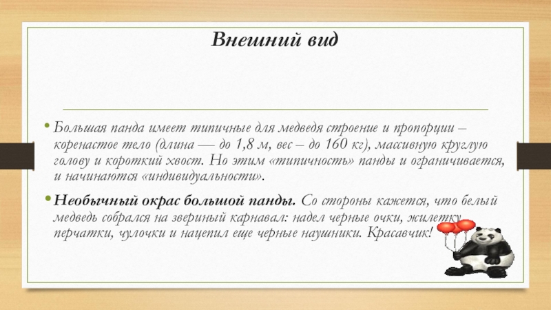 коренастое тело (длина — до 1,8 м, вес – до 160 кг), массивную круглую голову и короткий хвост. Но этим «типичность» панды и ограничивается, и начинаются «индивидуальности».