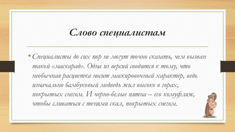 такой «маскарад». Одна из версий сводится к тому, что необычная расцветка носит маскировочный характер, ведь изначально бамбуковый медведь жил высоко в горах, покрытых снегом. И черно-белые пятна – его комуфляж, чтобы сливаться с тенями скал, покрытых снегом.