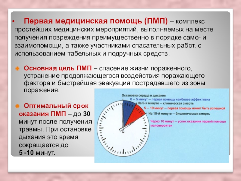 Основная цель ПМП – спасение жизни пораженного, устранение продолжающегося воздействия поражающего фактора и быстрейшая эвакуация пострадавшего из зоны поражения.