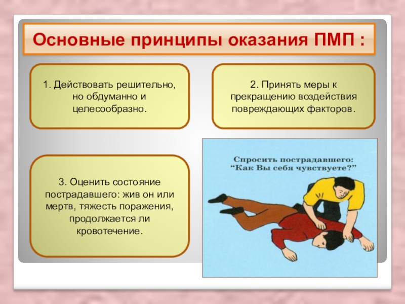 Основные принципы оказания ПМП :1. Действовать решительно, но обдуманно и целесообразно.2. Принять меры к прекращению воздействия повреждающих