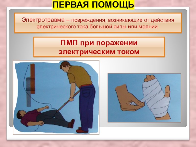 ПЕРВАЯ ПОМОЩЬПМП при поражении  электрическим токомЭлектротравма – повреждения, возникающие от действия электрического тока большой силы или