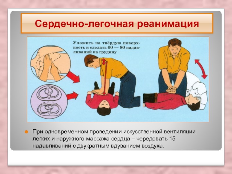 При одновременном проведении искусственной вентиляции легких и наружного массажа сердца – чередовать 15 надавливаний с двукратным вдуванием