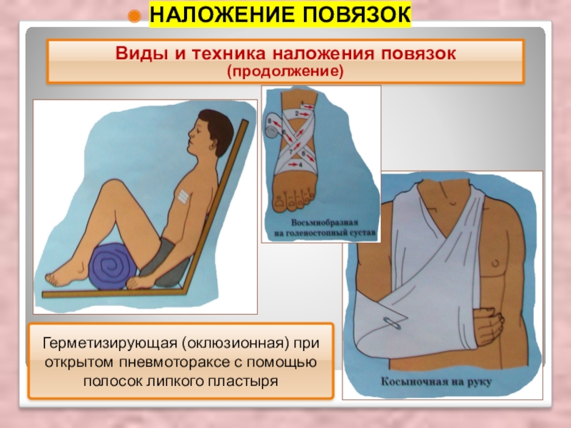 НАЛОЖЕНИЕ ПОВЯЗОКВиды и техника наложения повязок(продолжение)Герметизирующая (оклюзионная) при открытом пневмотораксе с помощью полосок липкого пластыря