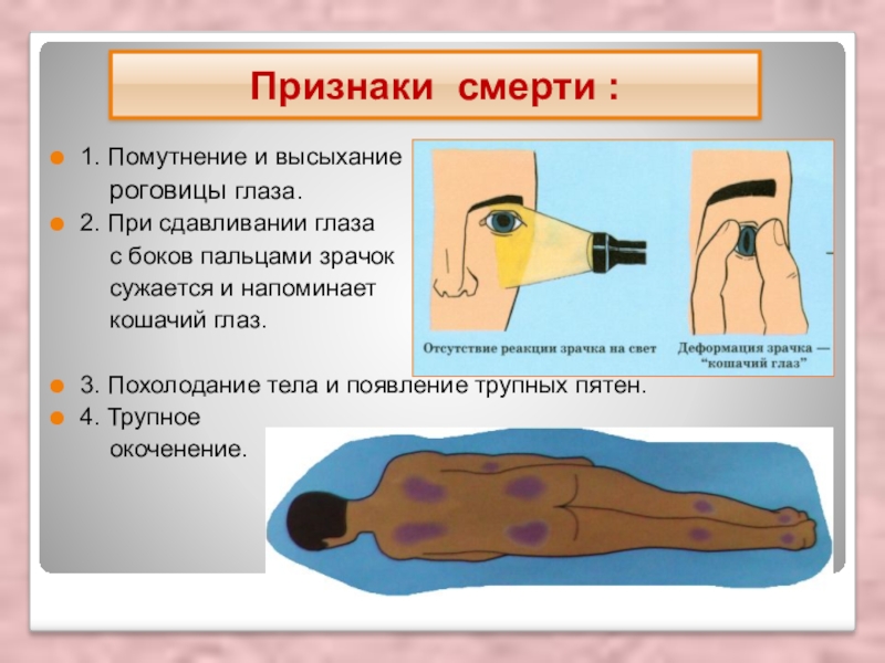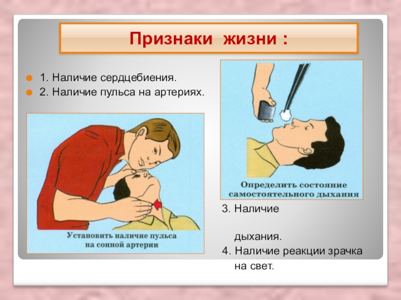 1. Наличие сердцебиения.2. Наличие пульса на артериях.