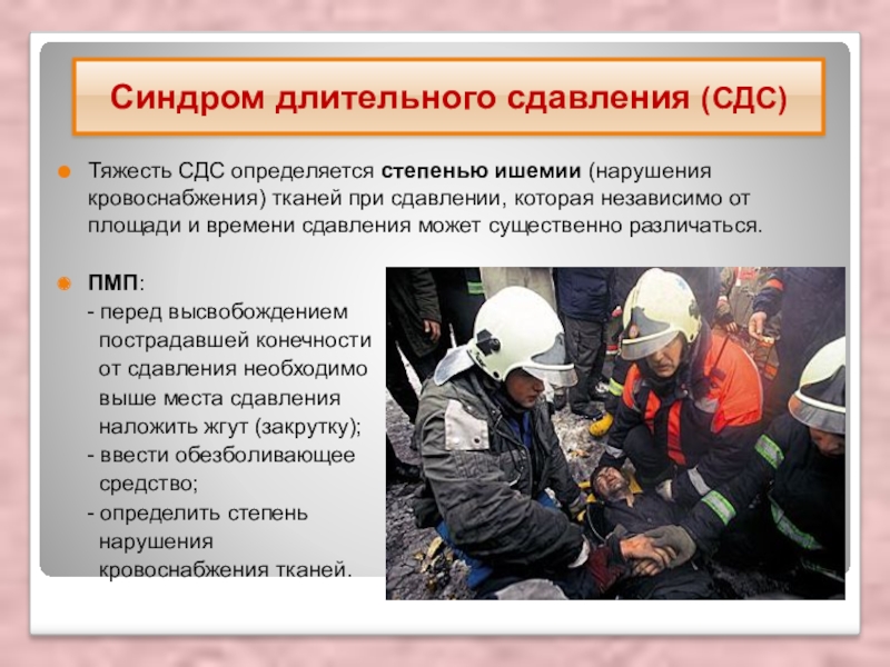 Слайд 23Тяжесть СДС определяется степенью ишемии (нарушения кровоснабжения) тканей при сдавлении, которая