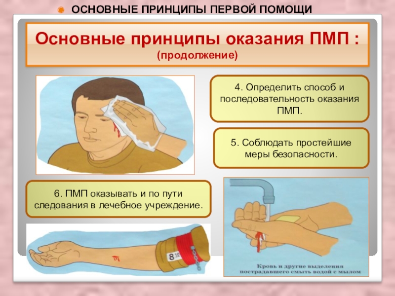Основные принципы оказания ПМП : (продолжение)6. ПМП оказывать и по пути следования в лечебное учреждение.5. Соблюдать простейшие