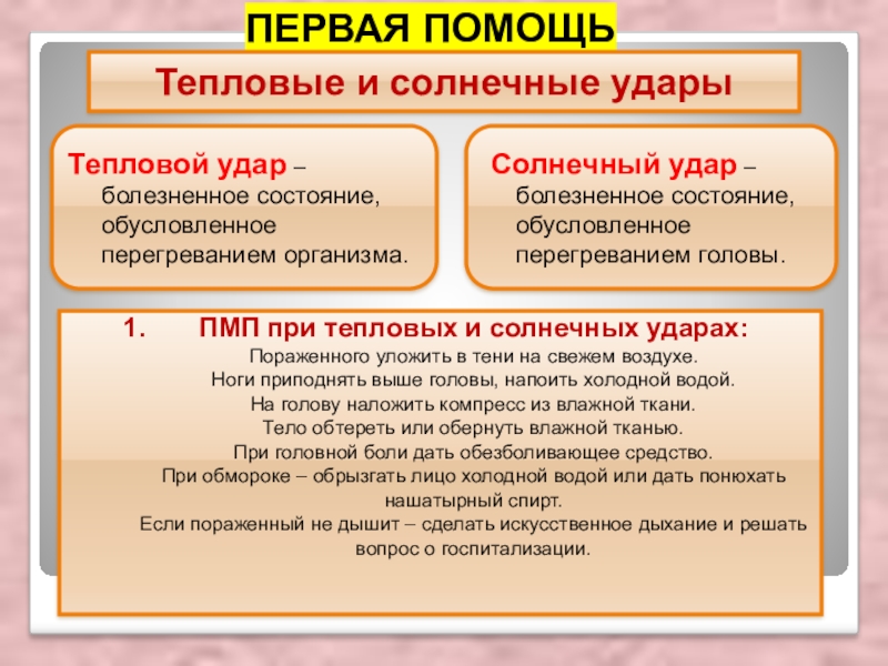 ПЕРВАЯ ПОМОЩЬТепловые и солнечные ударыТепловой удар – болезненное состояние, обусловленное перегреванием организма. Солнечный удар – болезненное состояние,