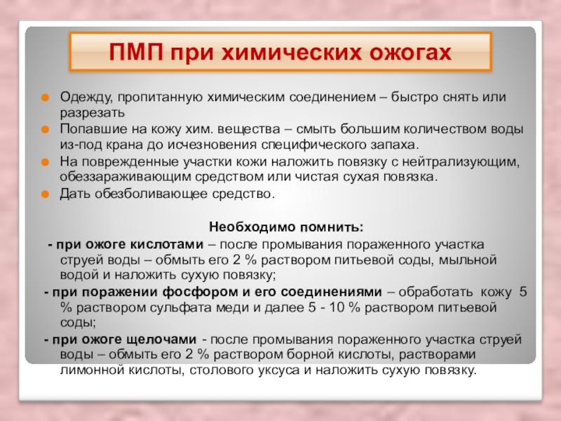 Одежду, пропитанную химическим соединением – быстро снять или разрезатьПопавшие на кожу хим. вещества – смыть большим количеством