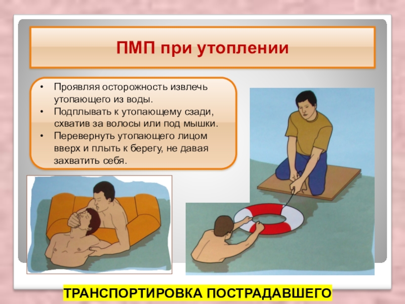 ПМП при утопленииТРАНСПОРТИРОВКА ПОСТРАДАВШЕГОПроявляя осторожность извлечь утопающего из воды.Подплывать к утопающему сзади, схватив за волосы или под