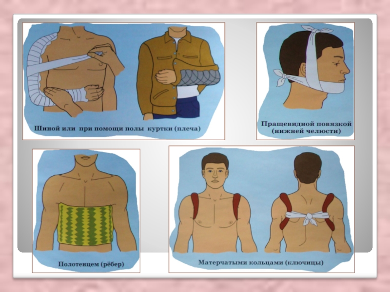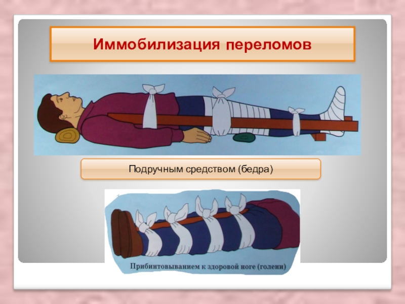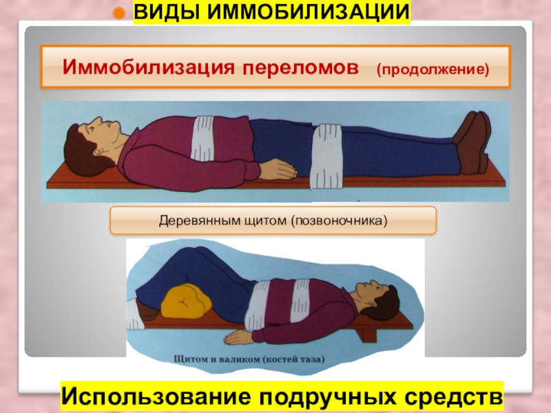 Использование подручных средствИммобилизация переломов  (продолжение)Деревянным щитом (позвоночника)ВИДЫ ИММОБИЛИЗАЦИИ