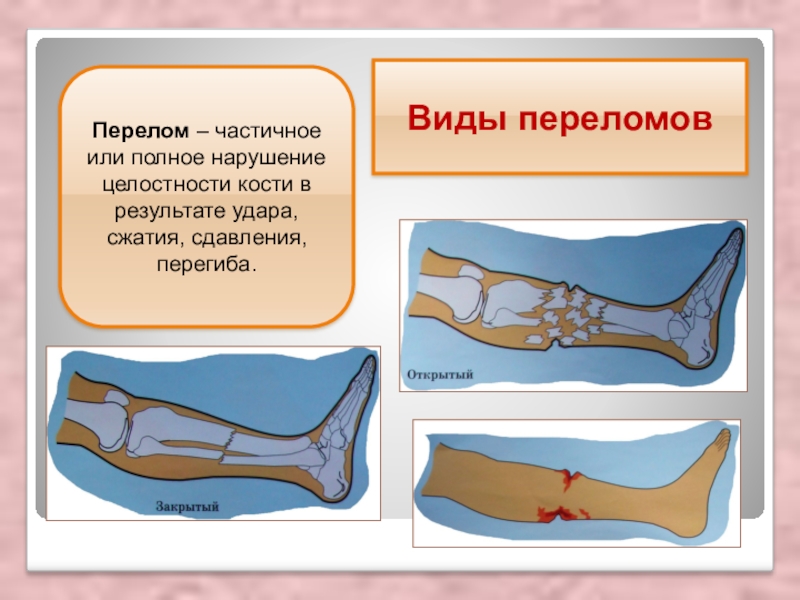 Виды переломовПерелом – частичное или полное нарушение целостности кости в результате удара, сжатия, сдавления, перегиба.