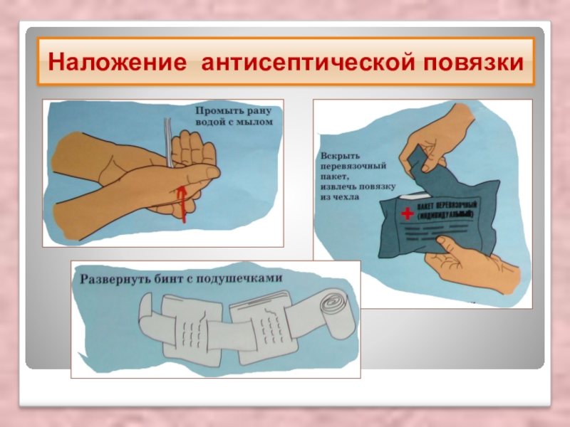 Наложение давящей повязкиКожу вокруг раны 2 -3 раза протереть кусочком марли или ваты, смоченной антисептическим веществом.