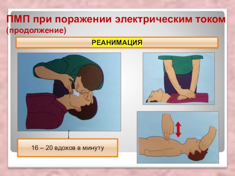 ПМП при поражении электрическим током (продолжение)РЕАНИМАЦИЯ16 – 20 вдохов в минуту