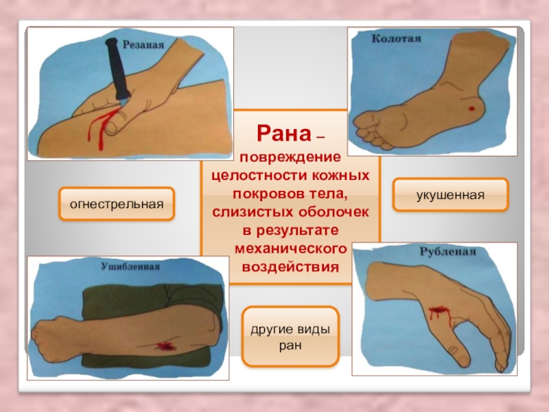 Рана –  повреждение целостности кожных покровов тела, слизистых оболочек в результате механического воздействияукушеннаяогнестрельнаядругие виды ран