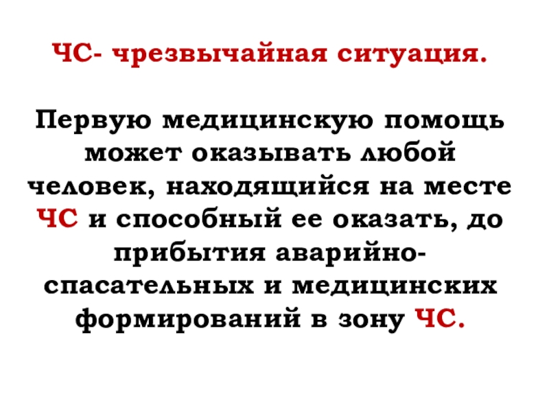 Первую медицинскую помощь может оказывать любой человек, находящийся на месте ЧС и способный ее оказать, до прибытия аварийно- спасательных и медицинских формирований в зону ЧС.