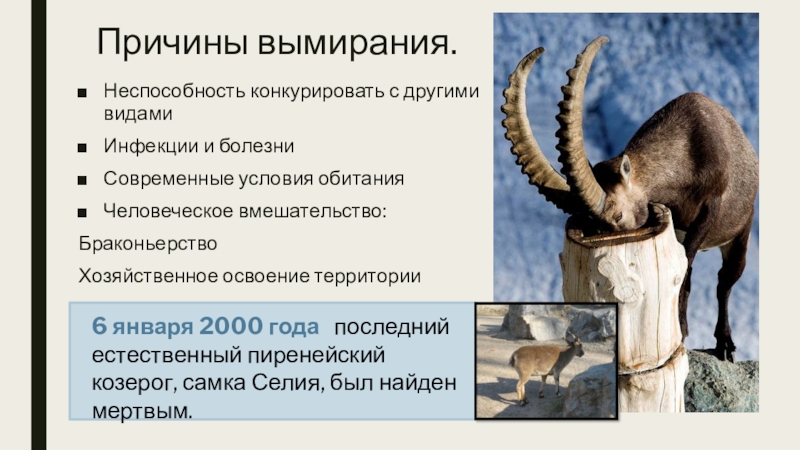6 января 2000 года последний естественный пиренейский козерог, самка по имени Селия, был найден мертвым.