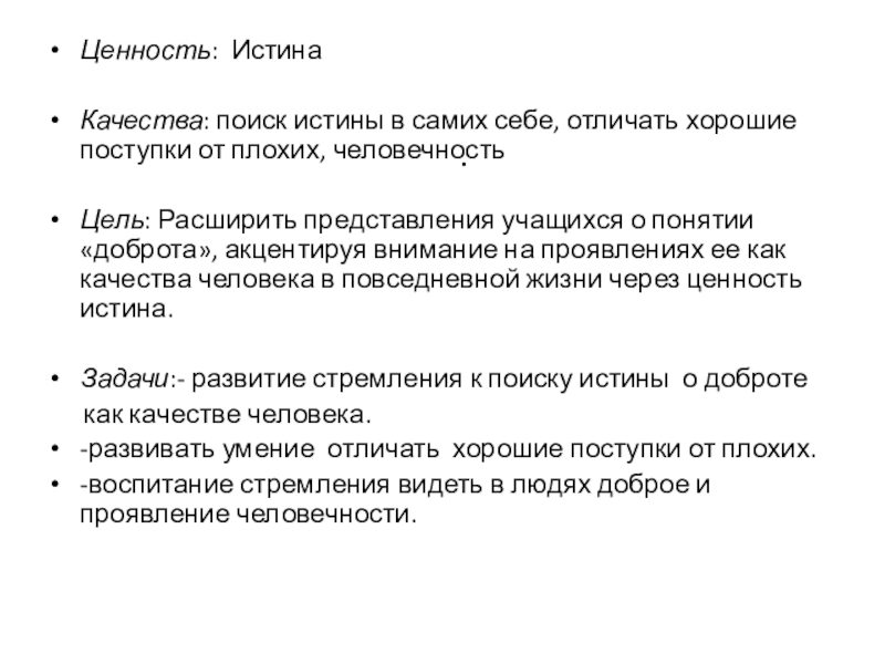 . Ценность: ИстинаКачества: поиск истины в самих себе, отличать хорошие поступки от плохих, человечностьЦель: Расширить представления учащихся