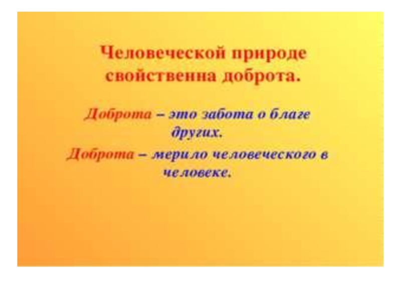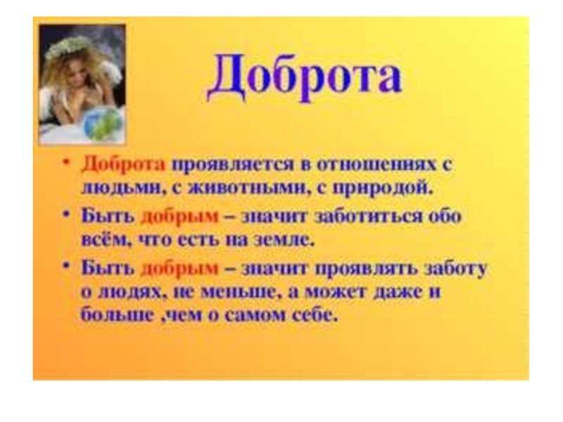 Цель: Расширить представления учащихся о понятии «доброта», акцентируя внимание на проявлениях ее как качества человека в повседневной жизни через ценность истина.