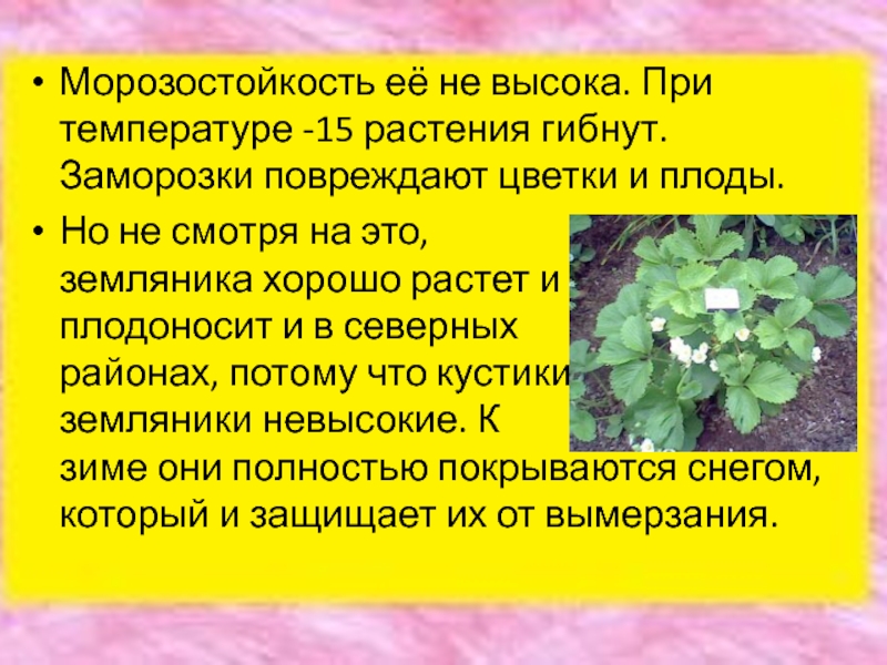 Слайд 12Морозостойкость её не высока. При температуре -15 растения гибнут. Заморозки повреждают