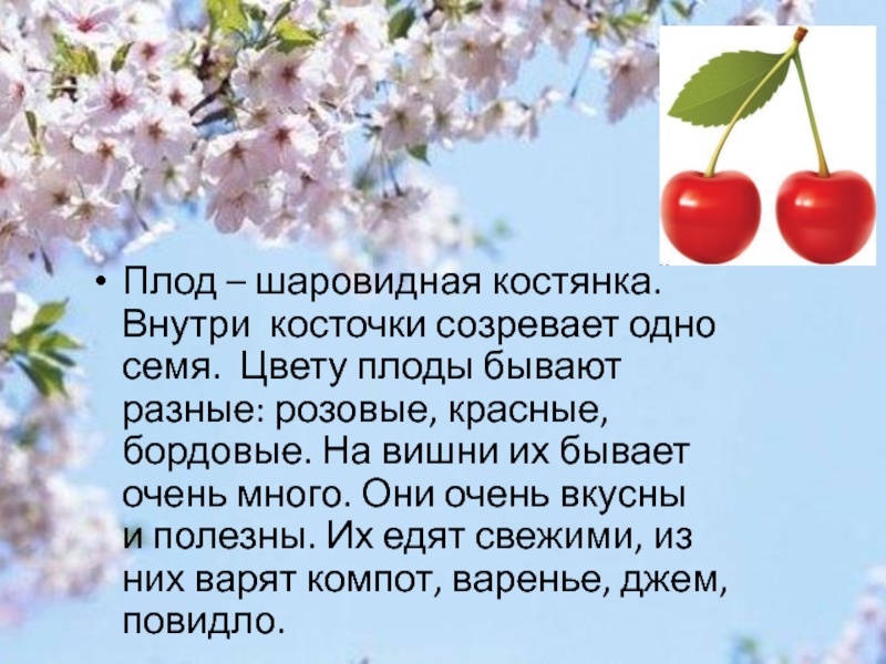 Внутри косточки созревает одно семя. Цвету плоды бывают разные: розовые, красные, бордовые. На вишни их бывает очень много. Они очень вкусны и полезны. Их едят свежими, из них варят компот, варенье, джем, повидло.