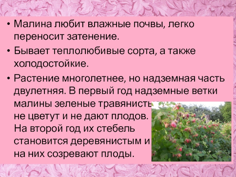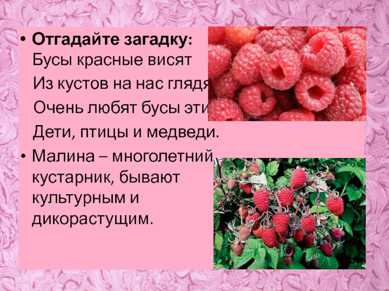 Малина – многолетний кустарник, бывают культурным и дикорастущим.
