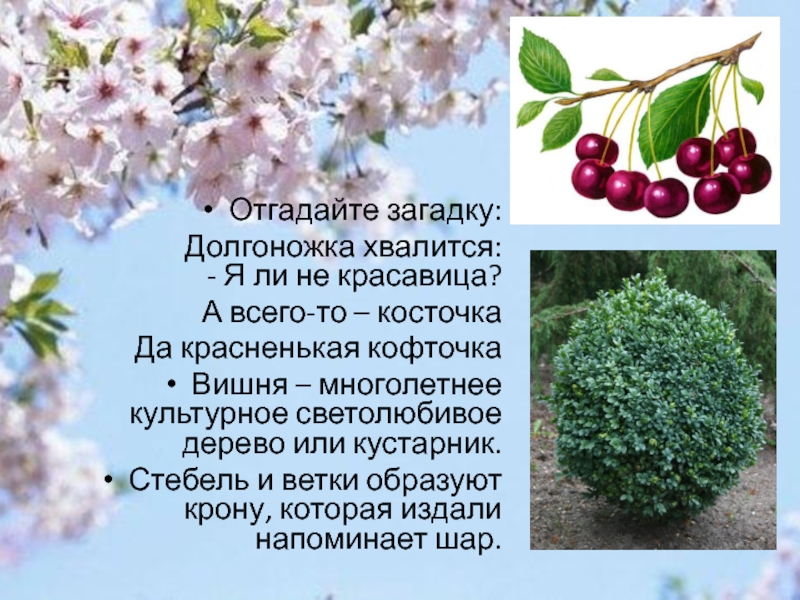 Вишня – многолетнее культурное светолюбивое дерево или кустарник.