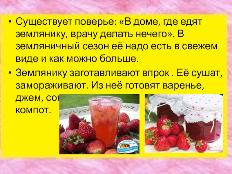 Слайд 15Существует поверье: «В доме, где едят землянику, врачу делать нечего». В