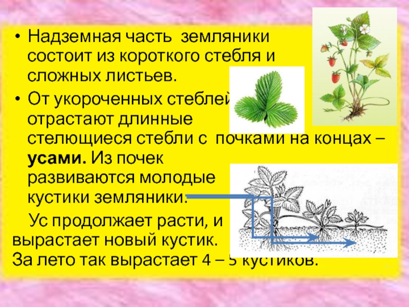 От укороченных стеблей отрастают длинные стелющиеся стебли с почками на концах – усами. Из почек развиваются молодые кустики земляники.
