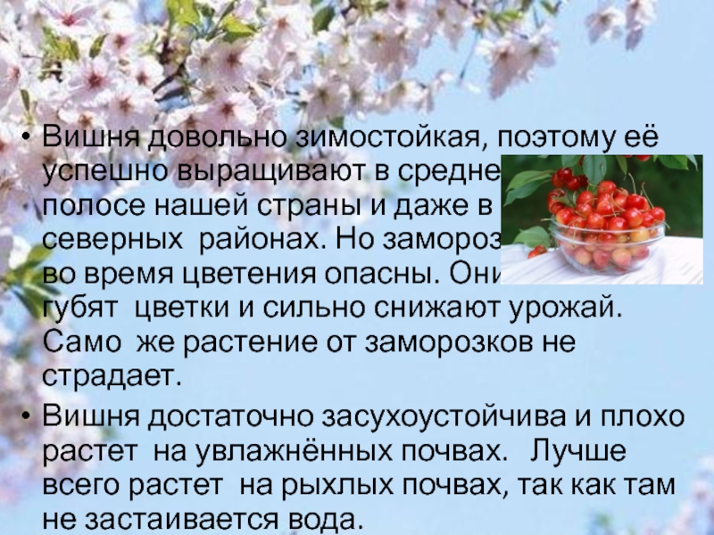 Слайд 5Вишня довольно зимостойкая, поэтому её успешно выращивают в средней